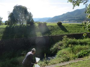 写真は、遠方の産卵床の場所を整備している場面で、次にその場所に砂利を敷くために青い容器に準備しています。