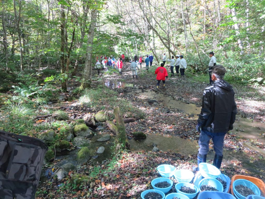 10/10 塩尻市奈良井の奈良井川上流で小水力発電所を運営するグリーン電力エンジニアリング(東京都)と当漁協が共催し、発電所近くにある奈良井川支流にイワナの産卵床を作りました。