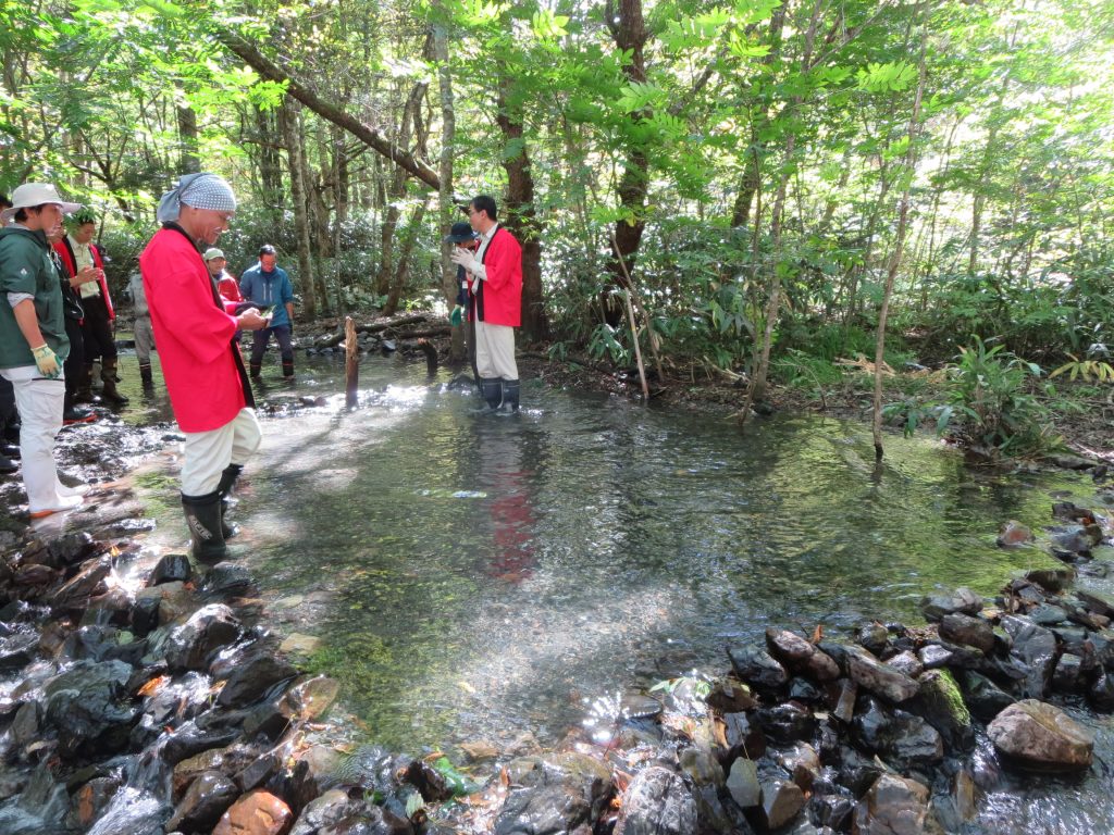 放流後には、児童の皆さんは、産卵床で泳ぐイワナを興味深く目で追いかけていました。
