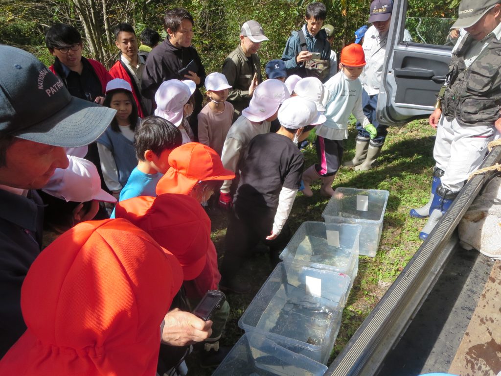 出来上がった産卵床に親イワナを放流する前に、水槽に入れたイワナを鑑賞するとともに、水産試験場の方にオスとメスの違いなど解説してもらいました。