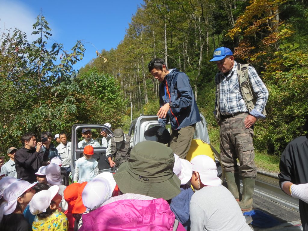 同社や組合関係者のほか地元の楢川小中学校の児童も参加して作業を行い、イワナが増えることを願いました。