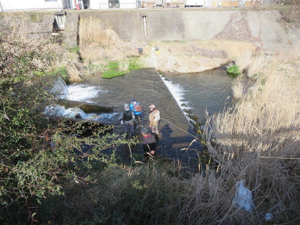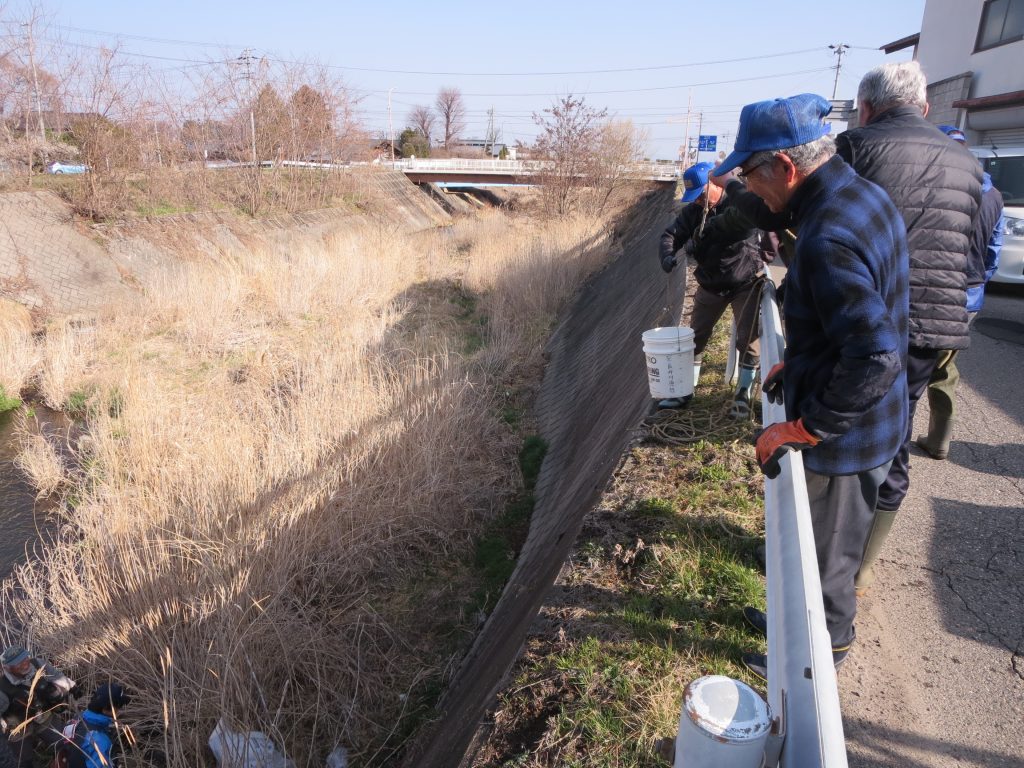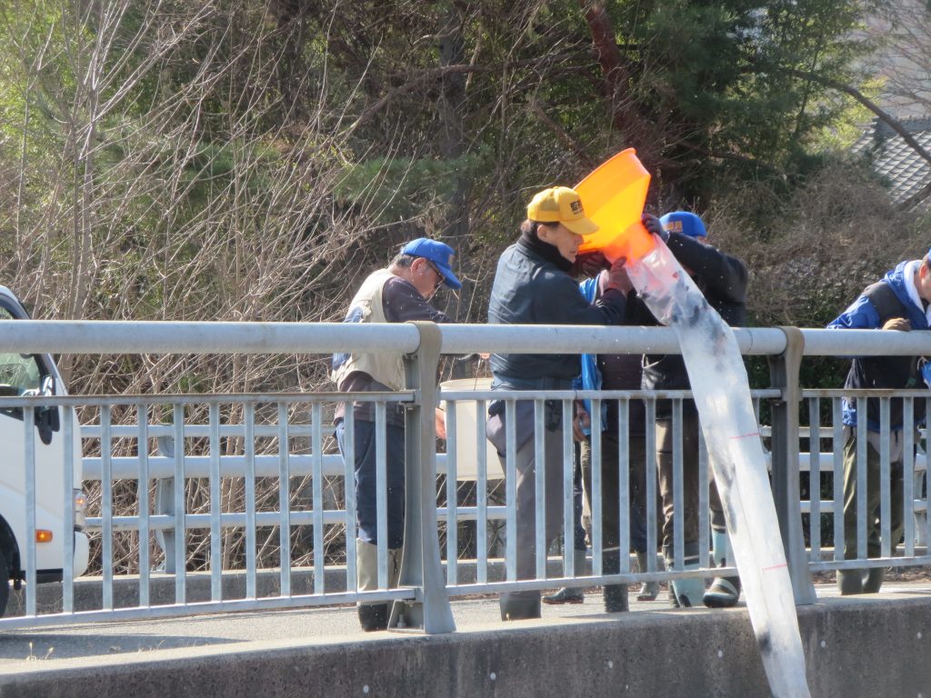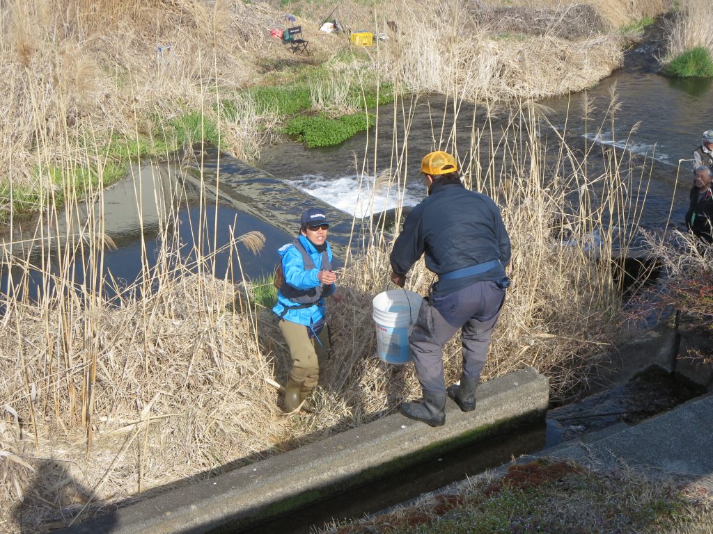 大正橋上流では、点々と10数か所にバケツリレーや特大ホースを使って放流しましたが、土手からの距離が離れている場合には、釣り人にも協力いただきました。