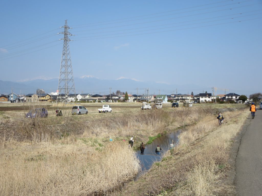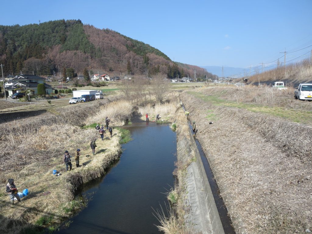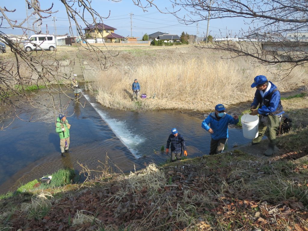 3/28(土)8時過ぎから田川(大正橋付近から外田橋付近まで)にニジマスを150キロ放流しました。
